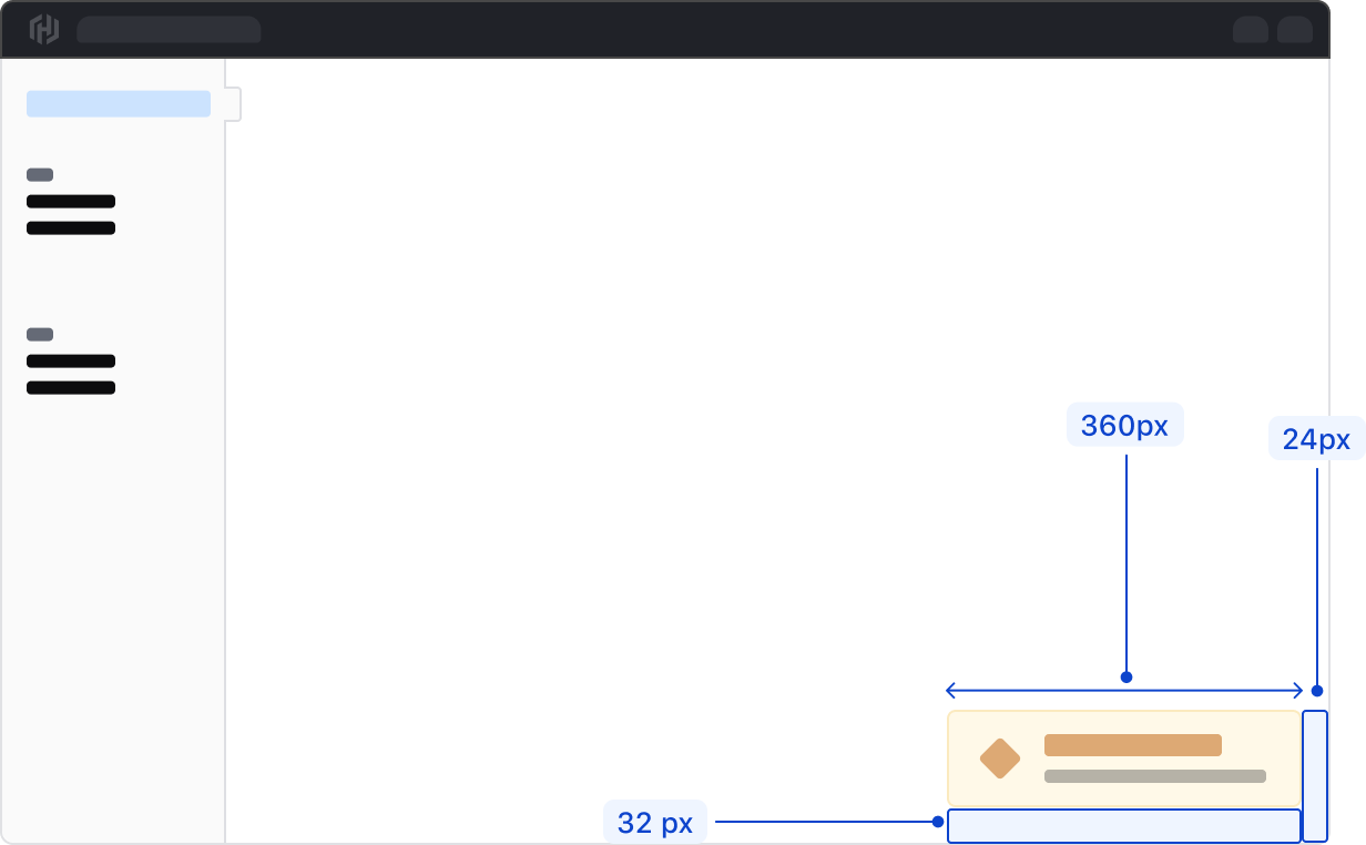 Toasts appear in the bottom right corner of the viewport with a margin of 32px from the bottom and 24px from the right side of the viewport. If a warning or error is contextual to a specific UI feature, such as a form, directly associate an Alert to that feature instead of using a Toast.